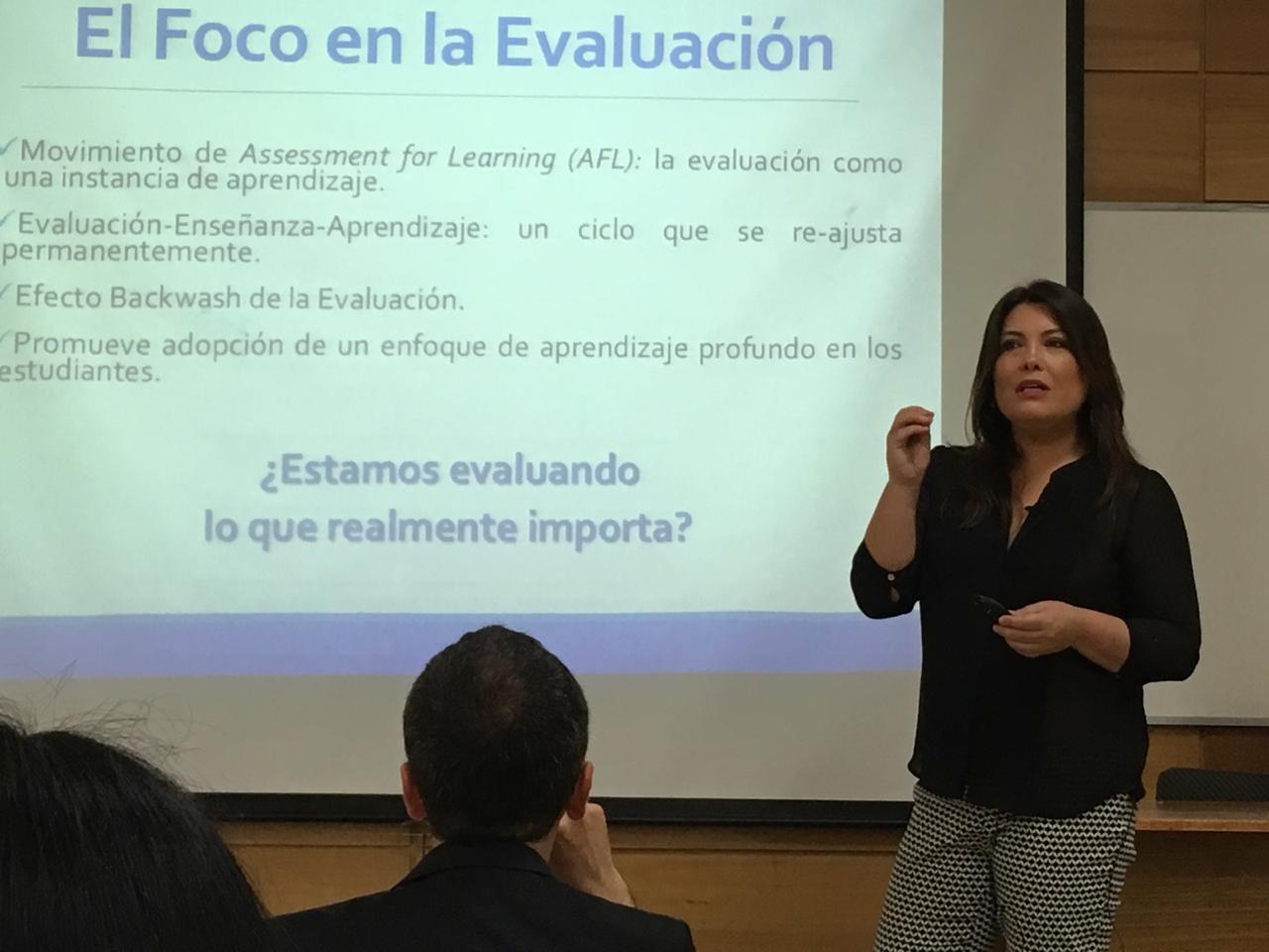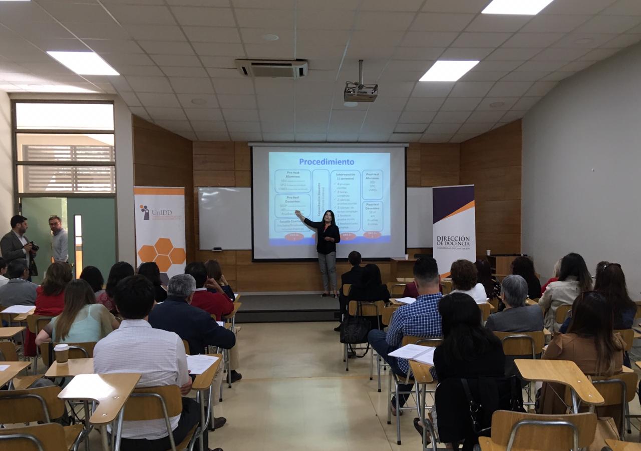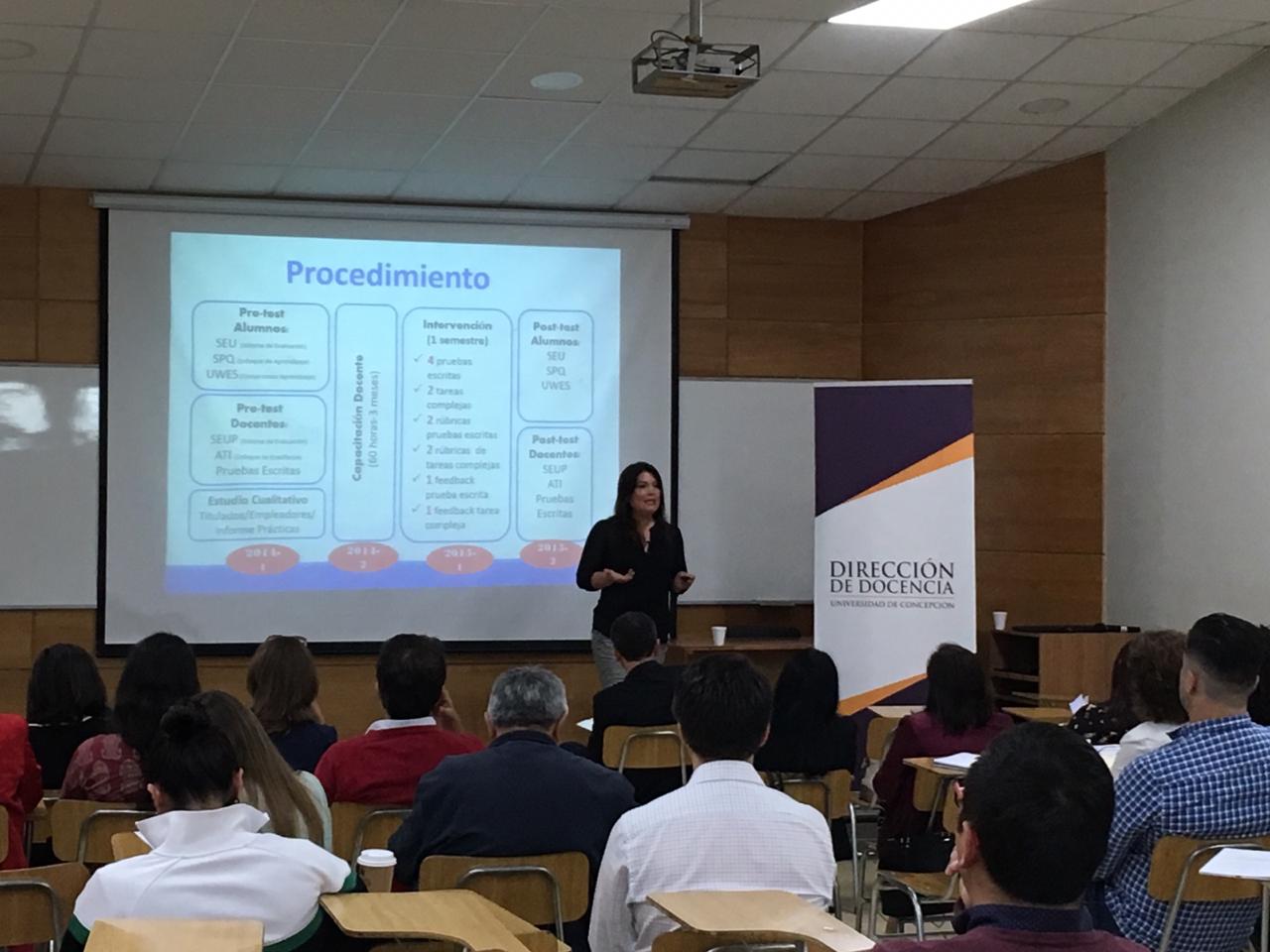 En la actividad organizada por la Dirección de Docencia de la UDEC, la Dra Villarroel fue la encargada de abrir las jornadas en cada una de sus sedes: Concepción, Chillán y Los Ángeles, con una Clase Inaugural sobre Evaluación Auténtica en la Educación Superior.