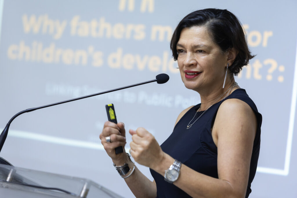 Durante el seminario, la investigadora profundizó en nuevas perspectivas sobre la paternidad a partir de evidencia científica que demuestra la relevancia del padre en el desarrollo infantil, integrando la ciencia del desarrollo con otras disciplinas y trascendiendo el estereotipo tradicional del padre como mero “proveedor”.
